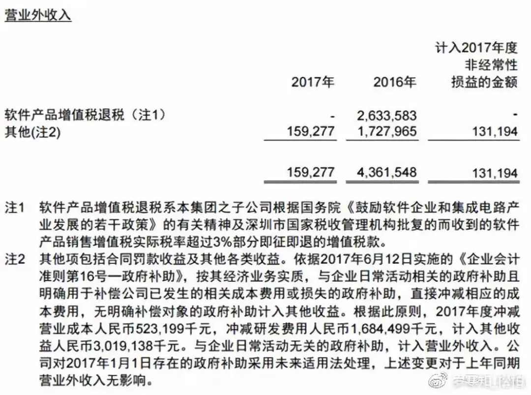 首先,上圖顯示華爲2017年因爲創新和研究等得到的政府補貼合計11.8億元,這個金額相對於華爲6000億的收入體量和近千億的研發投入來說完全可以忽略不計。