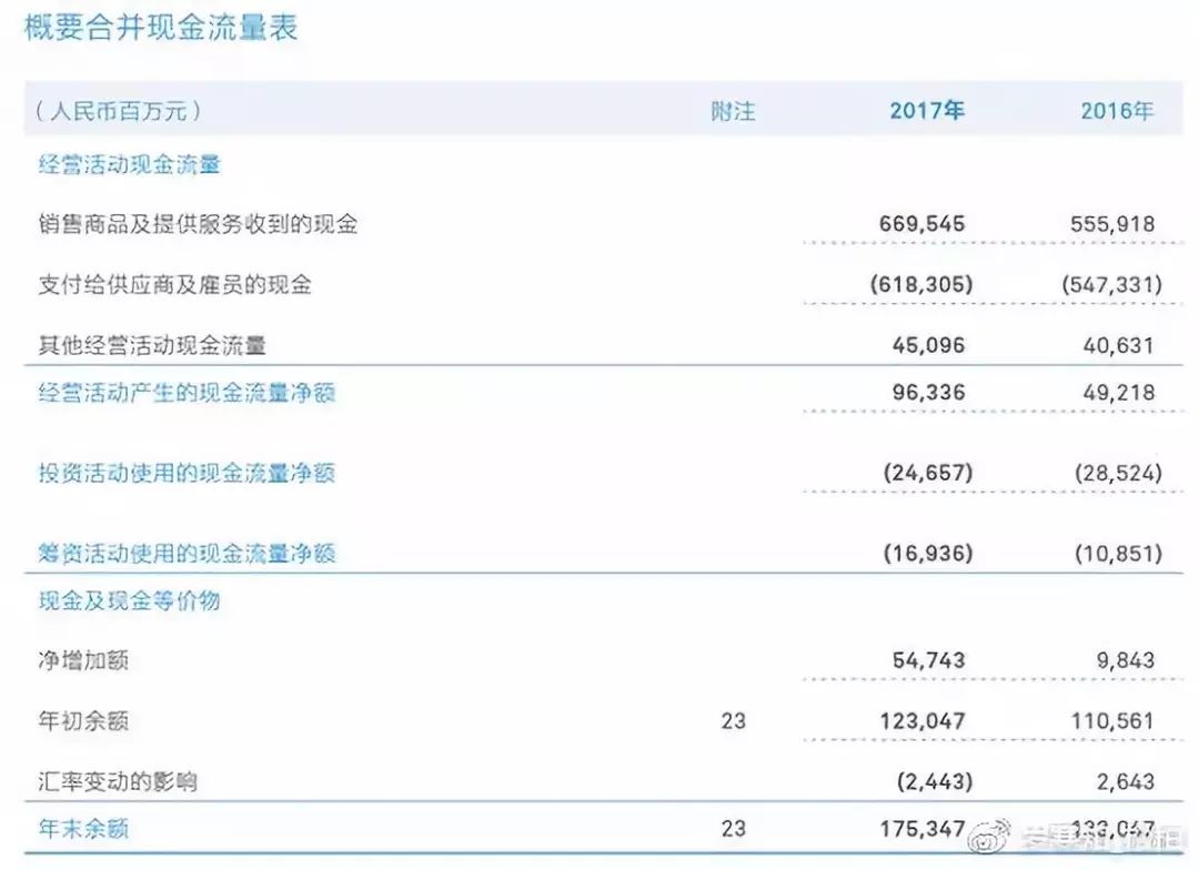 華爲沒有披露詳細的現金流量表,就算投資活動的現金流出247億全部都是資本支出(也可以與資產負債表裏的長期投資本年增加額覈對),那2017年自由現金流也高達963-247=716億元。這說明其盈利質量非常高,事實上其會計政策非常保守,這是經營現金流好的原因之二,後面我還會分析到。