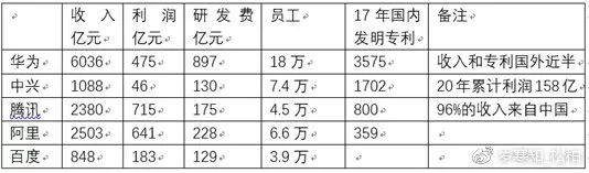 大家熟知的中國互聯網BAT三巨頭(其中阿里、騰訊市值已經排入全球前10),雖然騰訊和阿里的利潤都已經超過了華爲,但BAT三者合計起來的研發投入532億元僅爲華爲897億元的59%,2017年國內授權的發明數量合起來也沒華爲多,並且華爲還有佔比近半的國外的發明專利。我們都知道BAT的營收和利潤基本來自中國國內,比如騰訊的收入超過96%來自中國大陸。