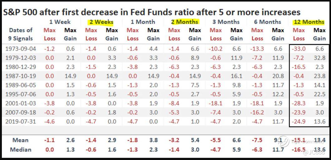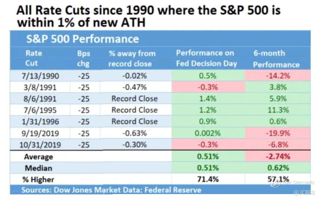 Dow Jones Market Data ran back the tape and found that since 1990, the Fed has cut rates 7 times while the $S&P 500(.SPX)$ was at or near (within 1%) of an all-time high (see below).
