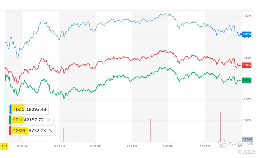 The tech-heavy $NASDAQ(.IXIC)$ led the gains, up roughly +2.5%. Best performer of the day.