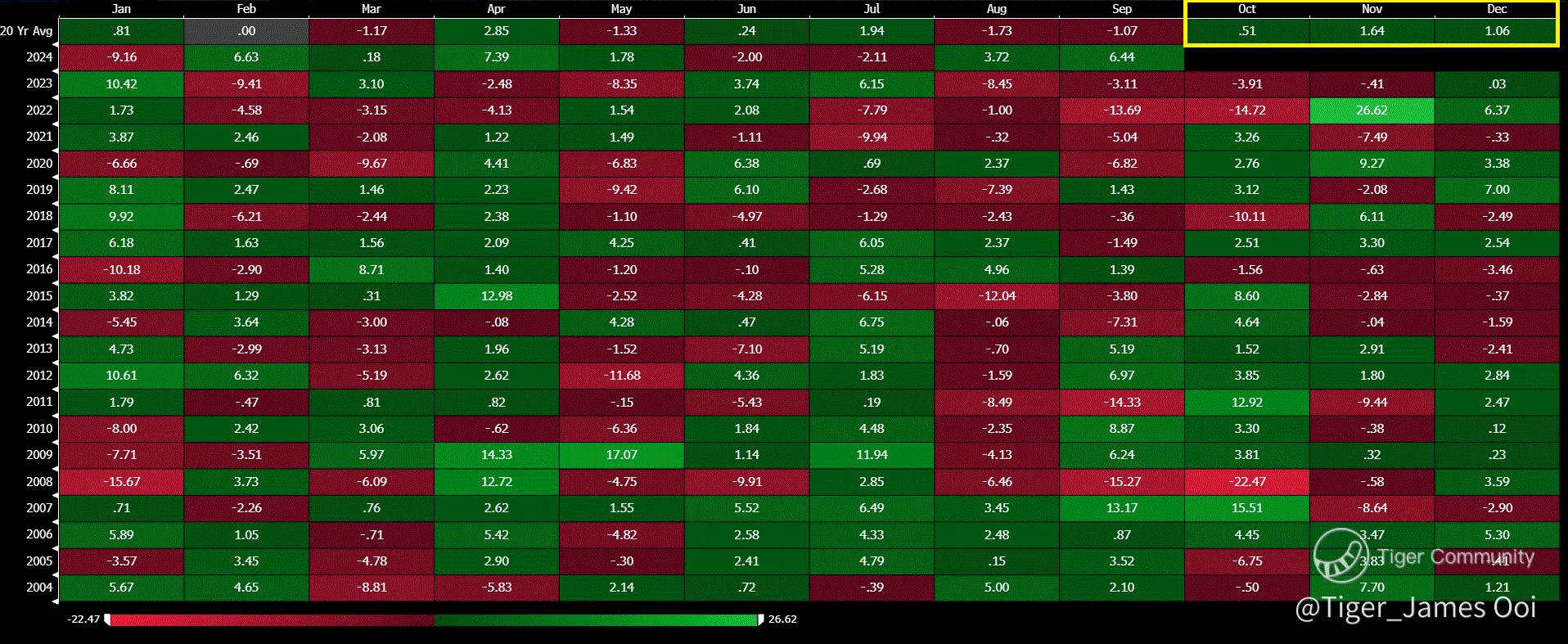 Over the past 20 years, the Hang Seng Index has generally returned 0.51%, 1.64%, 1.06%, and 0.81% in October, November, December, and January, respectively. I reckon the index could potentially rally from now until January based on positive seasonality.