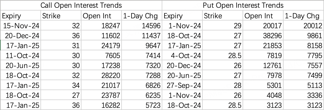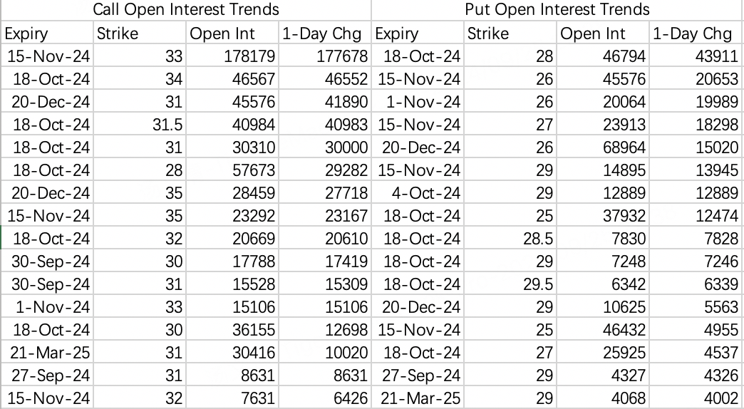Overall, the bias in Chinese stocks remains moderately bullish currently. To hedge against potential selloffs, one could sell fairly basic out-of-the-money puts to collect premium decay, such as the $KWEB 20241101 29.0 PUT$ .
