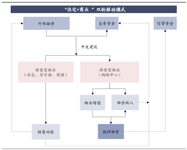 在出售物業和持有物業當中,不僅不是割裂關係,相反則存在着相當程度的協同——出售物業爲購物中心導流,而購物中心提升配套提升出售物業的去化率與溢價水平。