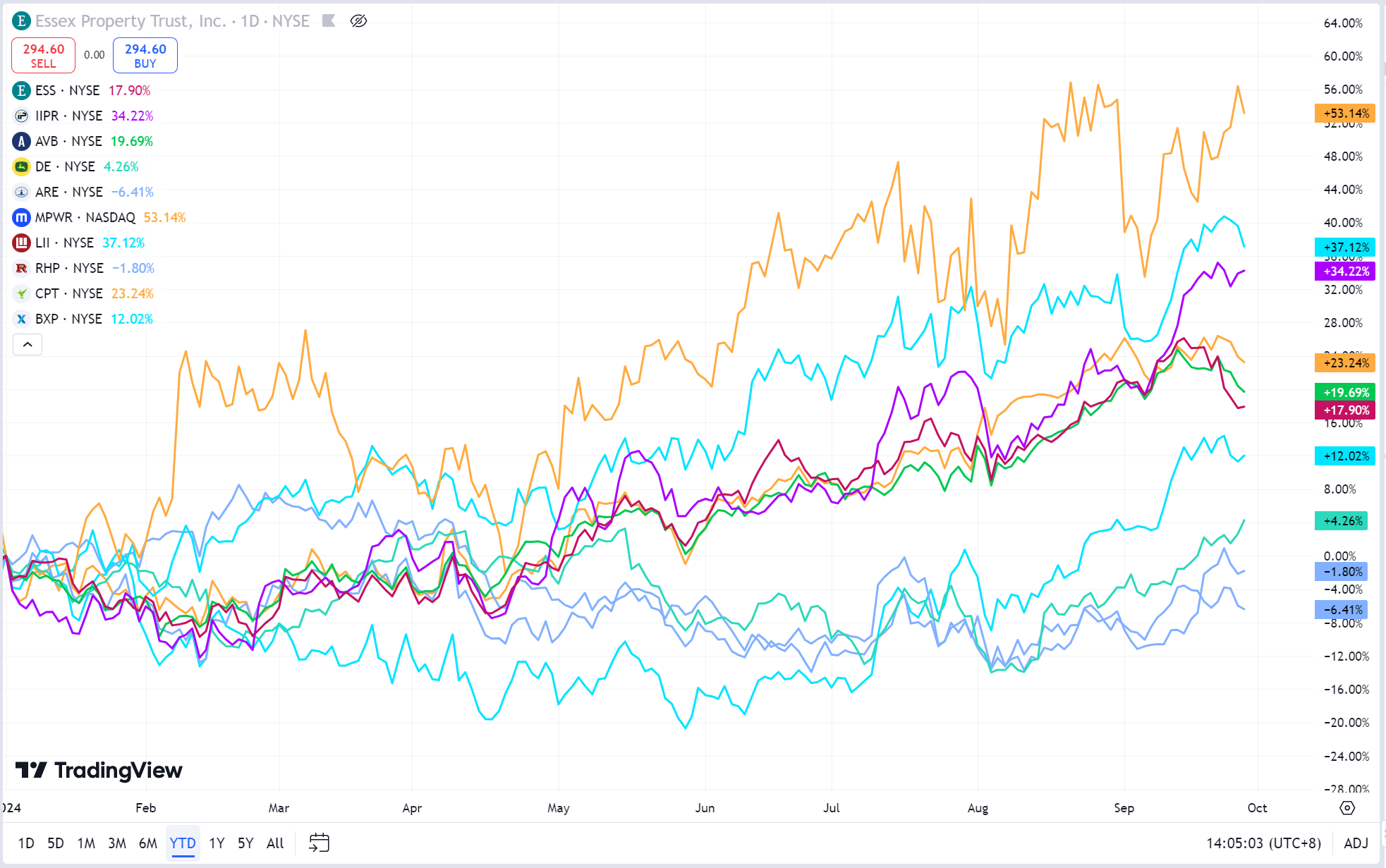 At the time of publication, data from TradingView reveals that in 2024, $Essex Property(ESS)$ $Innovative Industrial Properties Inc(IIPR)$ , $AvalonBay Communities(AVB)$ $John Deere(DE)$ $Monolithic Power(MPWR)$ $Lennox(LII)$ $IQ Real Return ETF(CPI)$ and $BXP Inc(BXP)$ have all posted gains. In contrast, Alexandria Real Estate Equities (ARE) and Ryman Hospitality Properties (RHP) have reported losses this year.