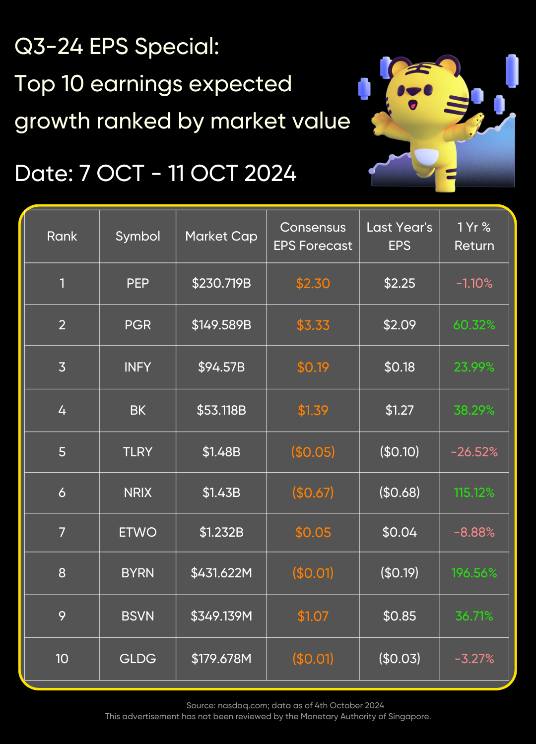 On October 7 to October 11, $Pepsi(PEP)$ , $Progressive(PGR)$ , $Infosys(INFY)$ , $Nurix Therapeutics(NRIX)$ , $E2open Parent Holdings, Inc.(ETWO)$ , $Byrna Technologies Inc.(BYRN)$ , $Bank7 Corp.(BSVN)$ and $GoldMining Inc.(GLDG)$ are releasing their earnings, and consensus earnings per share forecasts are higher than data from the same period last year.