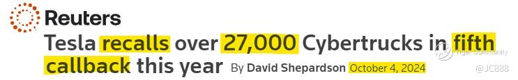 On Fri, 04 Oct 2024 - it was reported that Tesla would recall > 27,000 Cybertrucks in the US. (see above)