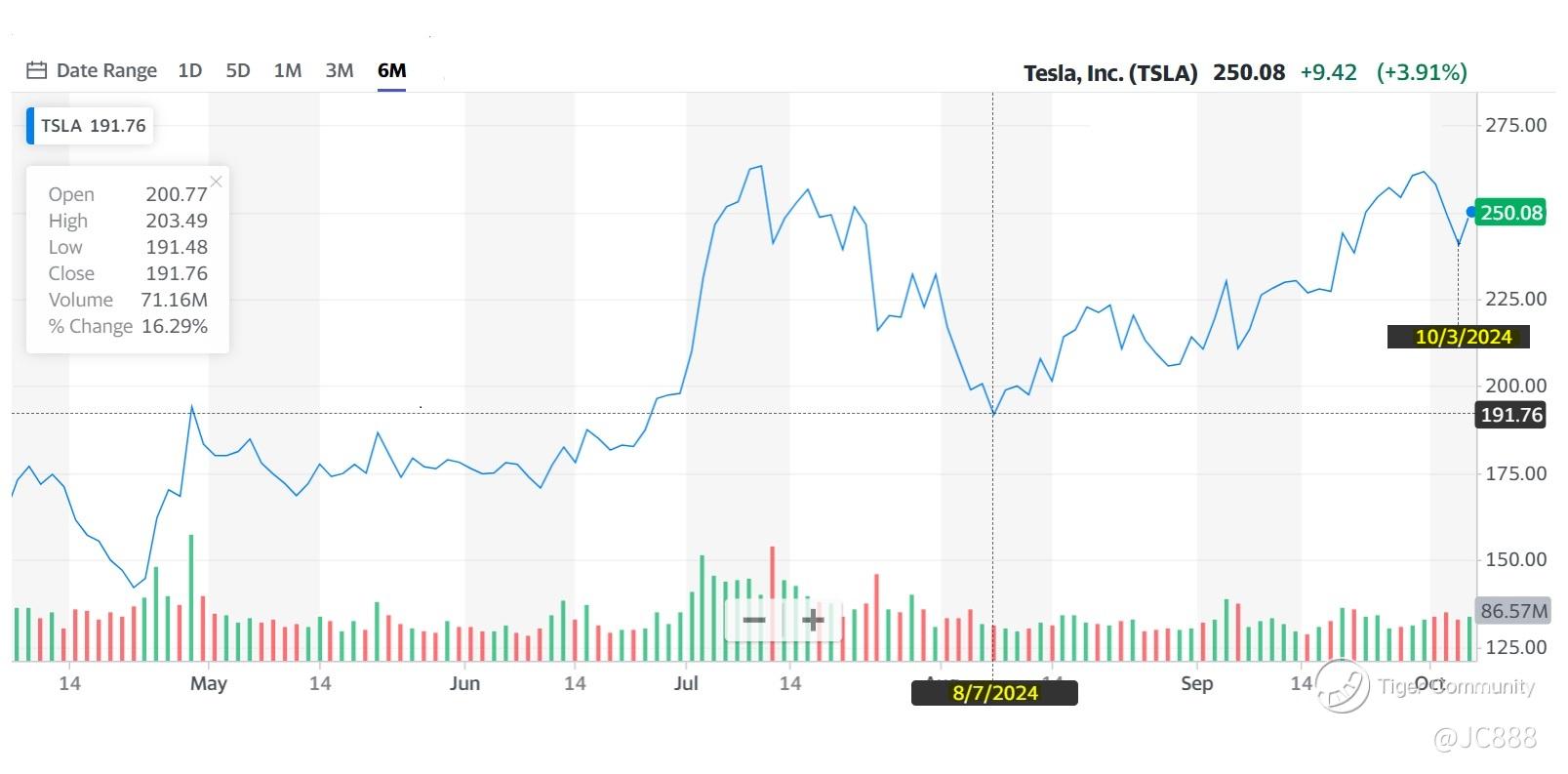 Is the ”impending robotaxi unveil ” the speculative catalyst that accounts for Tesla’s upwards trend since 7 Aug 2024 ? Plausible ? (see below)