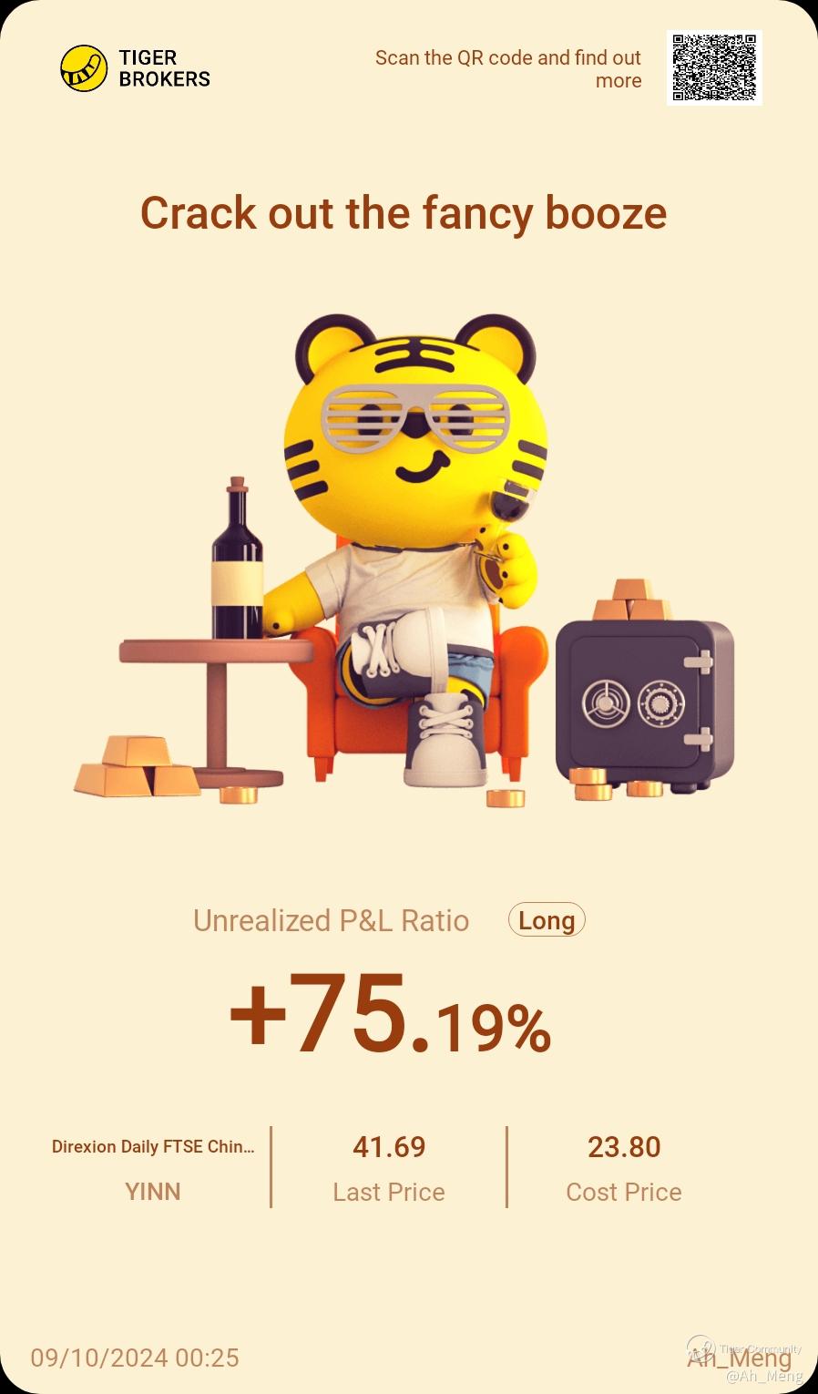 $Direxion Daily FTSE China Bull 3X Shares(YINN)$ I leave this image for memory... A bull riding that I just did... And take profit when it is time. Perhaps I am running early, maybe I am right. I won't know for now... Discipline calls... YINN has done me proud even if it losts a hefty 30% today alone... Knowing when to cut and run is difficult. It is a skill that needs a lifetime perfecting... Will close my Auto-Invest position for this counter and enjoy the party on the side, knowing that I should not regret my today's action either way...