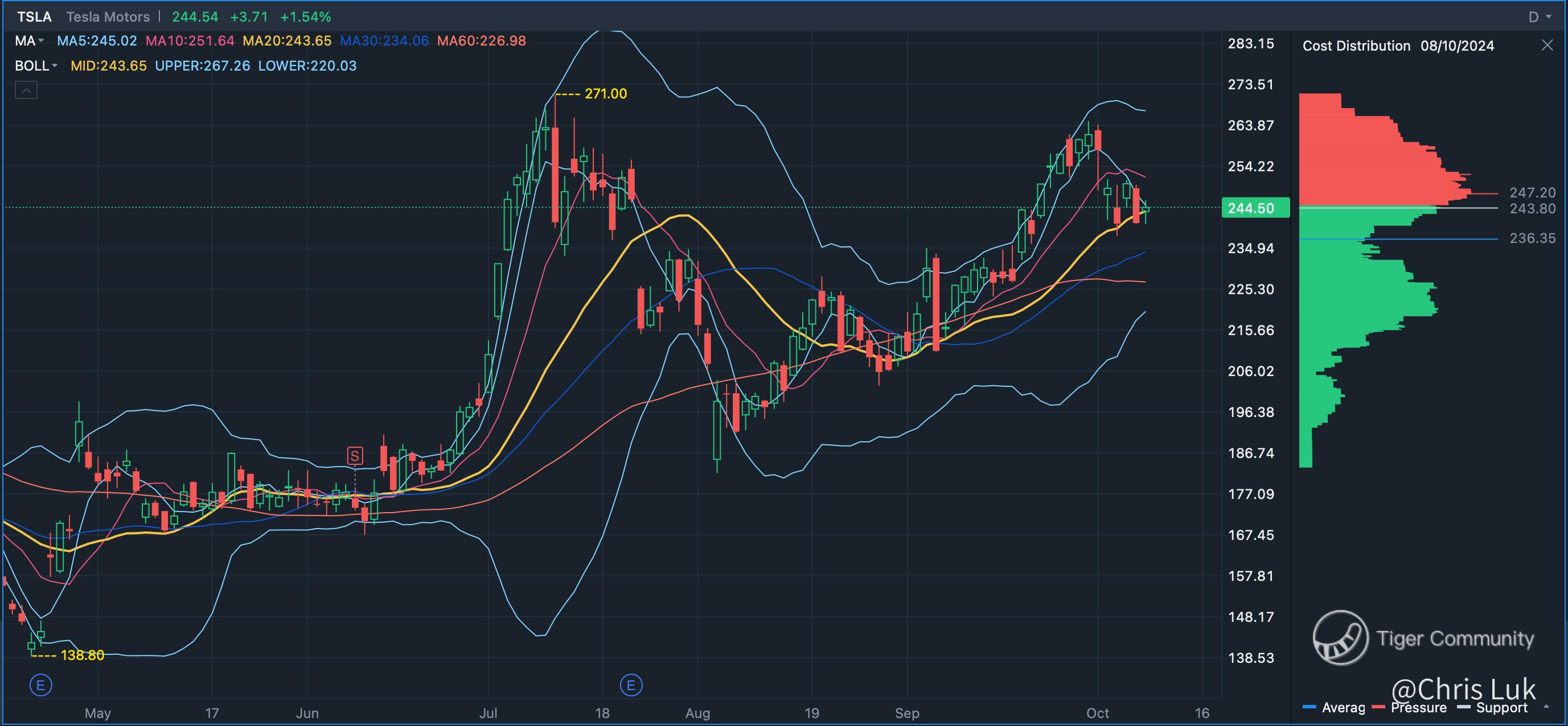 Tesla’s ( $Tesla Motors(TSLA)$ ) highly anticipated “We, Robot” event, centred around the launch of its autonomous taxi service, has ignited significant buzz. CEO Elon Musk has claimed this to be Tesla’s most important event since the launch of the Model 3 in 2014, signalling a potential turning point for the company. But will Tesla soar past $300, or could the stock suffer a major setback?