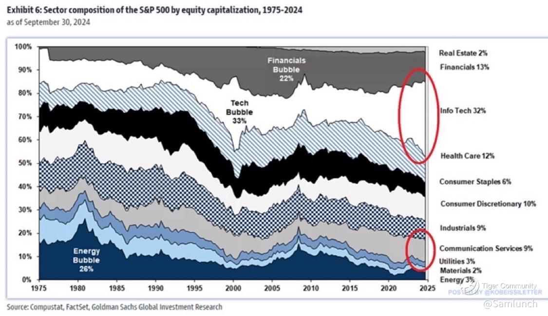 The US information technology sector as a percentage of the S&P 500 is now 32%, the most since the 2000 Dot-Com Bubble.