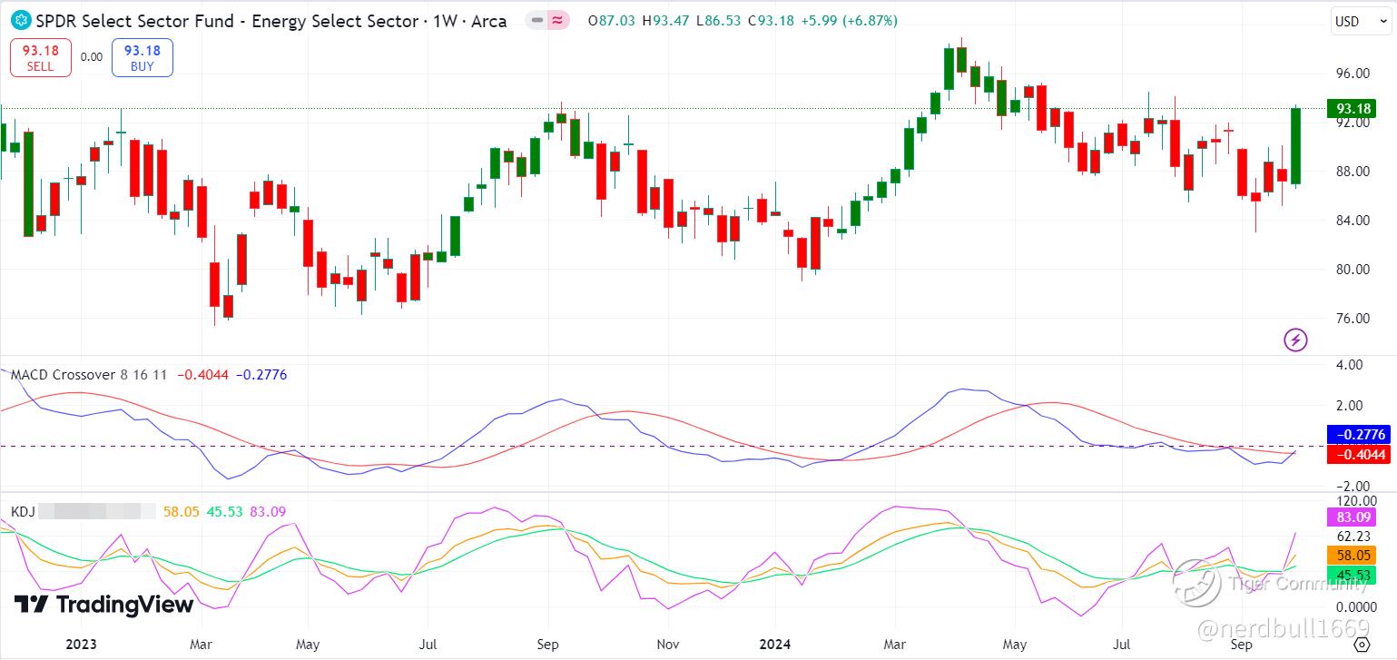 To take advantage of the rise in energy stocks, we could invest in $Energy Select Sector SPDR Fund(XLE)$ and the weekly chart is showing that there is potential upside as MACD is forming a bullish upside trend.