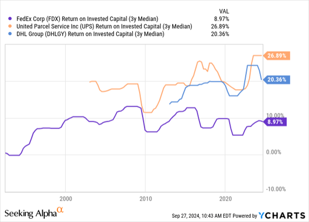 Over the next 5 years, UPS expects to heavily invest in automation, including highly automated distribution centers. According to FreightWaves, UPS will close and consolidate 200 sorting centers across the US, with the new consolidated centers having ~30% additional handling capacity. While we remain skeptical of the total estimated savings of $3 billion per year in savings, UPS claims it will realize $1.5 billion by 2026. For the remainder of 2024, UPS expects to spend less than originally anticipated in capex, now only projecting about $4 billion. As discussed in our FedEx article, UPS has industry-leading return on invested capital, leading with a 3-year median of 26.89%.