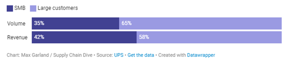 To keep margins high during low-volume periods, UPS is repositioning to appeal more to SMBs Currently SMBs make up 29% of UPS’s US volumes, with a target of 40%. Though in the international segment, the mix is more favorable with around 60% SMB. With large customers the prices charged are usually negotiated, offering little in terms of margin. According to a former marketing director speaking to SupplyChainDrive the contribution margin of a single SMB package can often equal 10 enterprise packages.