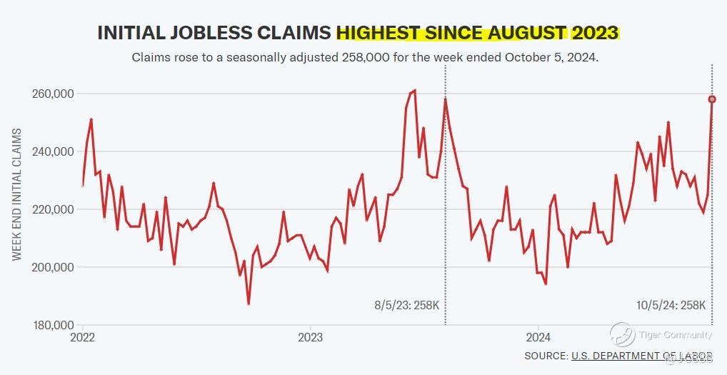 Initial filings for unemployment benefits took an unexpected turn higher, hitting as seasonally adjusted 258,000 for the week ending 5 Oct 2024, a 14-month high - since Aug. 5, 2023.