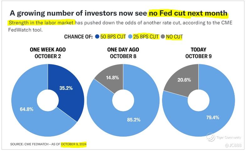 Amid all the moving parts, traders now see a 20.6% chance (as of 9 Oct 2024) that the Fed will hold rates steady in November, (see above right circle).