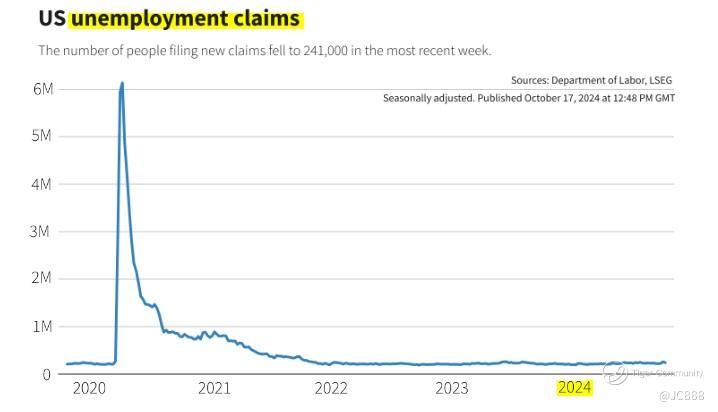 For week ending 12 Oct 2024, the Labor Department reported that jobless claims have fallen by -19,000 to a seasonally adjusted 241,000, in lined with Wall Street estimates.