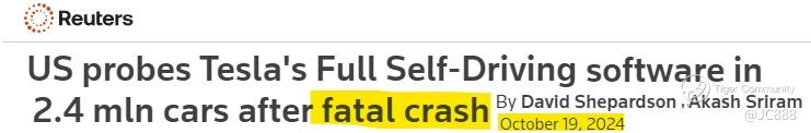 On Fri, 18 Oct 2024, the US Federal auto regulators -National Highway Traffic Safety Administration (NHTSA), has opened an investigation into 2.4 million Tesla EVs equipped with the car maker's Full Self-Driving (FSD) software.