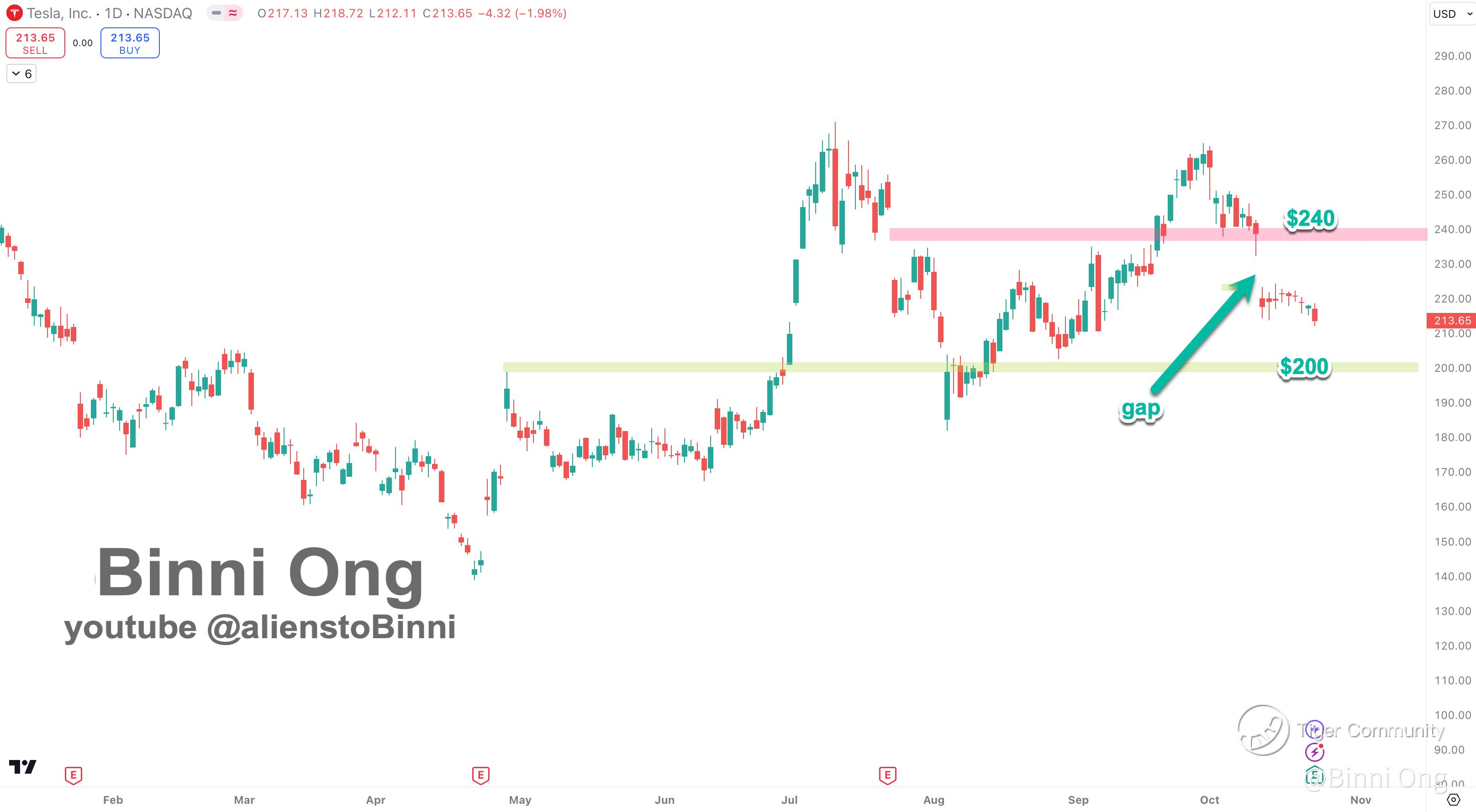 In the earlier post, I mentioned two key levels: $240 as the resistance and $200 as the support. If the price moves to $240 but fails to break through, it remains resisted. The good news is that the gap caused by the robotaxi news will be closed.
