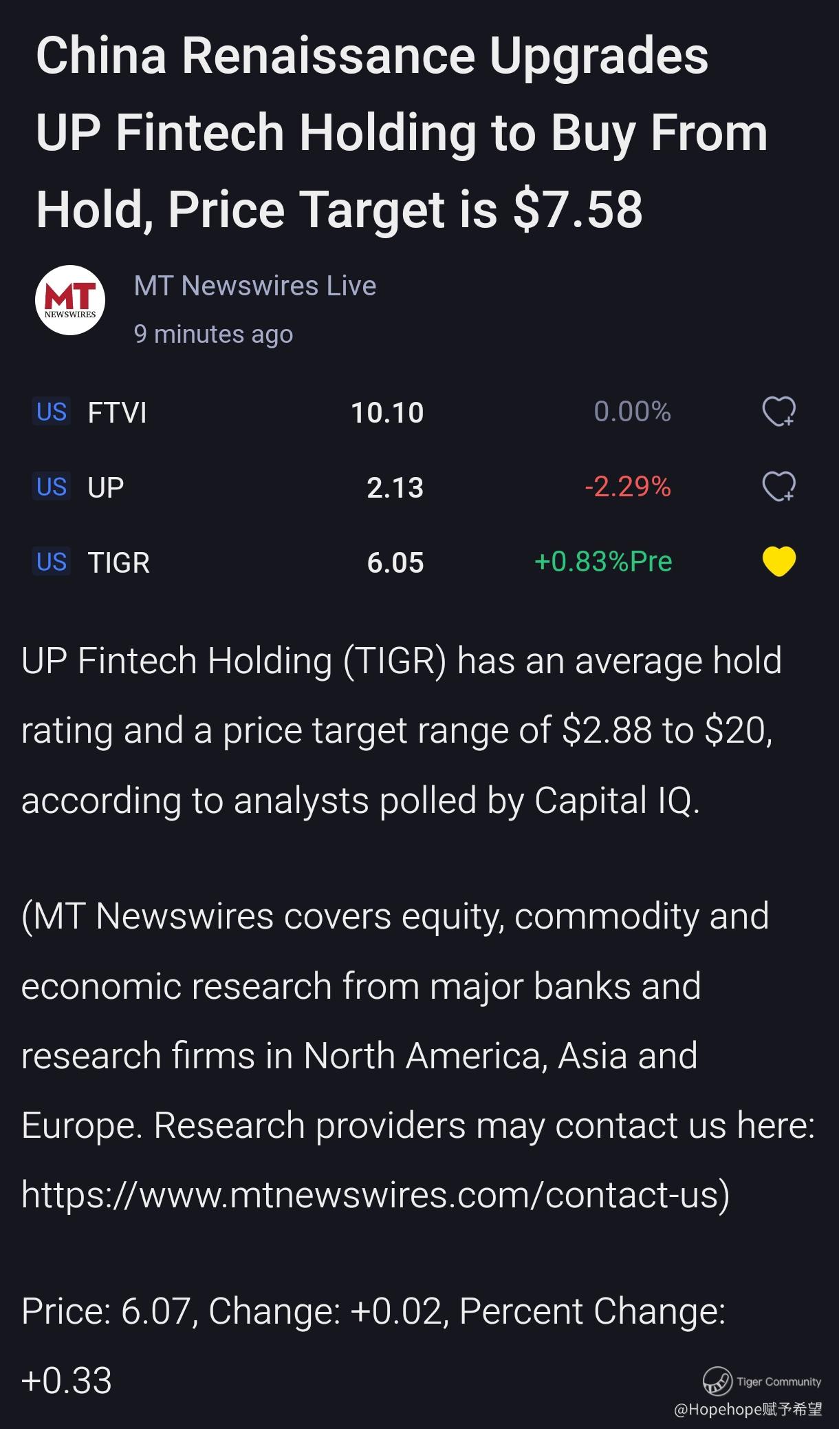 $Tiger Brokers(TIGR)$ one has to have your own view. Sellers will keep using narratives like citigroup issues a sell notice but didn't even read that the price target has been revised upwards. As for buyers, they will share you the analyst updated view including this one screenshot, the one from DBS and the one from citic securities with price target of 20 uss. The money is yours and you need a view of your own.