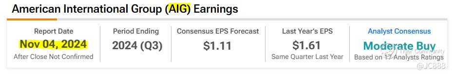 $American International Group Inc(AIG)$. Reporting Q3 earnings on 04 Nov 2024, evening.