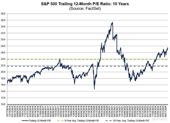 The trailing 12-month P/E ratio for $SPX of 27.4 is above the 5-year average (23.9) and above the 10-year average (21.8). - FactSet
