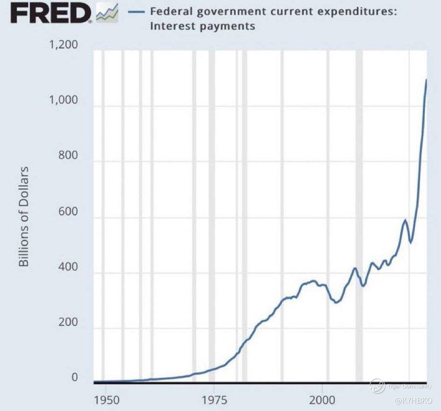 This is not Apple, Tesla or even Nvidia. This are interest payments on the US national debt of $36 trillion. We now pay nearly $1.2 trillion per year in interest on the debt, and about 23% of all taxes, tariffs and fees collected by the US govt goes to paying interest on the debt. -X user Wall Street Silver