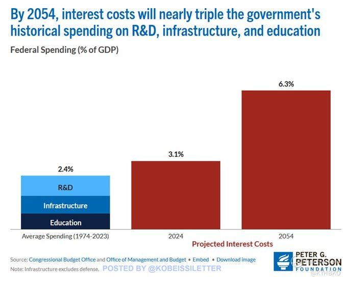US net interest costs as a share of GDP are set to reach 6.3% by 2054, the highest on record. This will be more than DOUBLE the 3.1% projected for the Fiscal Year 2024. To put this into perspective, interest costs will nearly triple the government's average historical spending on R&D, infrastructure, and education COMBINED. Interest payments have reached $1.1 trillion over the last 12 months, exceeding defence spending for the first time. At the current pace, interest will soon be the largest expense in the Federal budget, surpassing Social Security. We are on an unsustainable fiscal path.