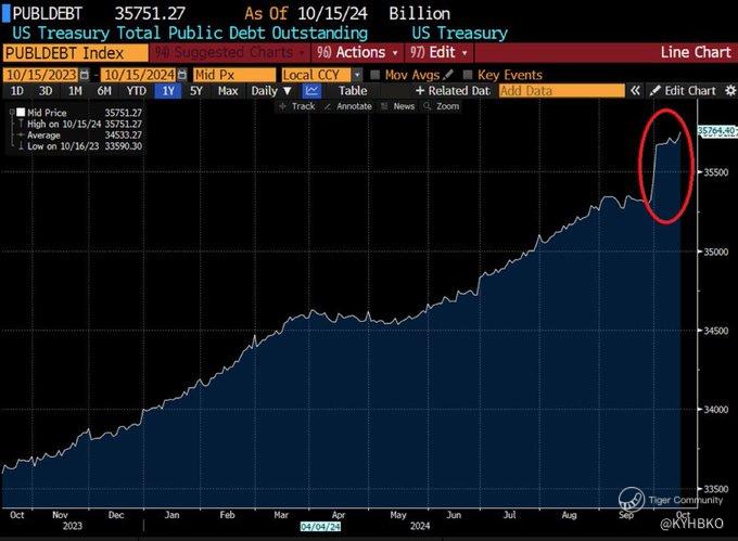 You can't make this up: Total US debt has jumped by $473 BILLION over the last 3 weeks alone, to a record $35.8 trillion. This means the US has taken on $1,450 of debt for EVERY American over the last 3 weeks alone. It also means that the US now holds a record $103,700 of debt for every American. In 2024, the US paid a total of $1.16 trillion of interest on this debt in its first year above the $1 trillion mark. In interest alone, the US paid $3,360 for every American during fiscal year 2024. What is the long-term plan here?