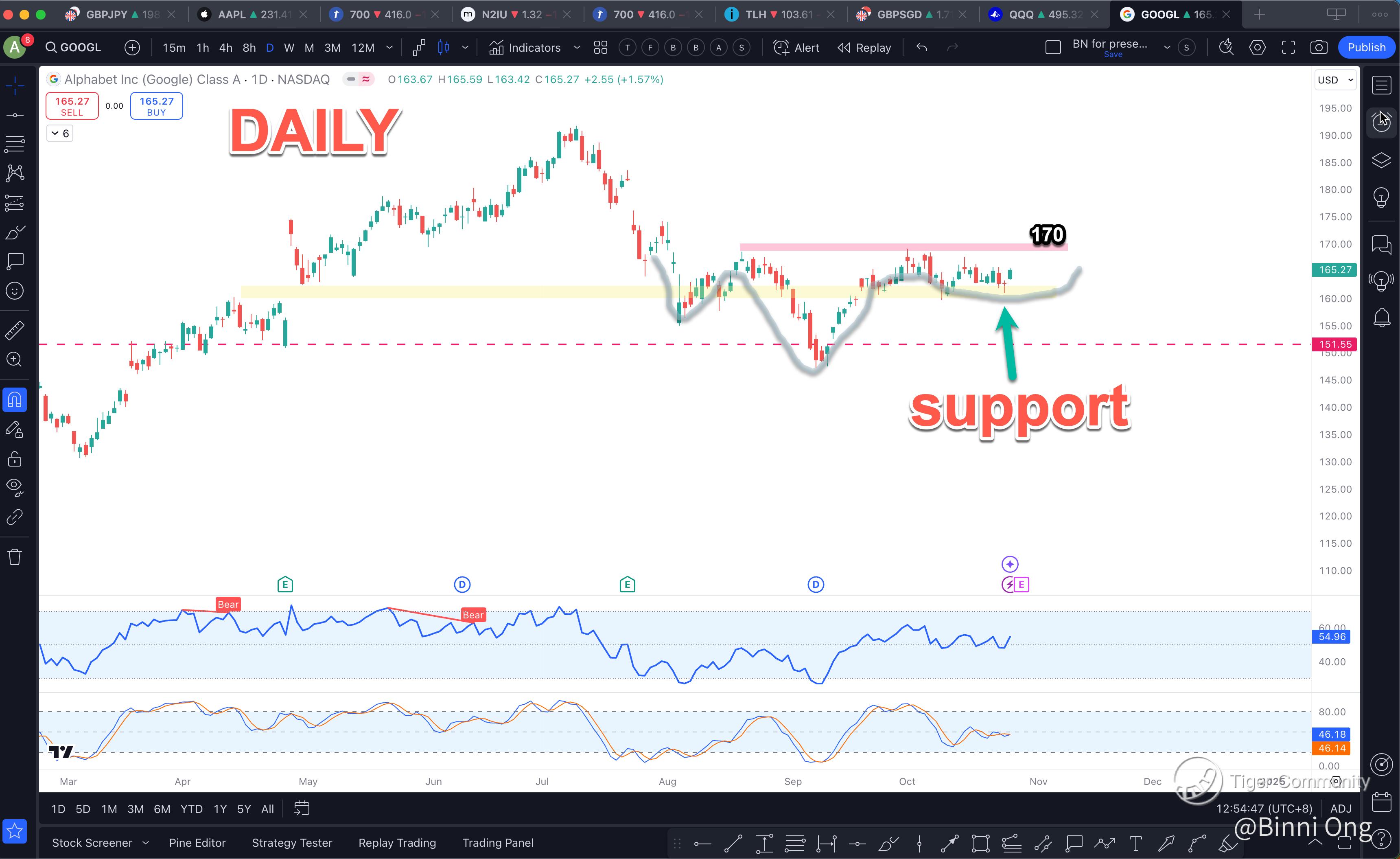 2. Support and Resistance Levels: On the daily chart, support is holding at $160, with resistance at $170. The current pattern resembles an inverted head and shoulders, which often signals a potential upward move.