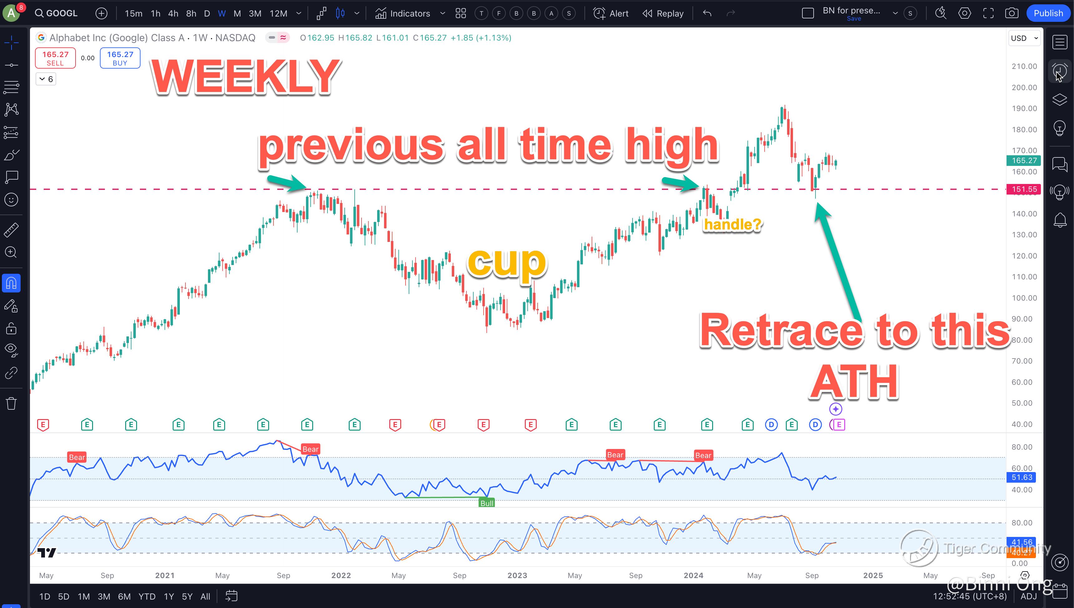 1. Breakout from All-Time High: The price recently broke its all-time high of $152 following a bullish cup and handle pattern and has now retraced close to this level (see my weekly chart for details).