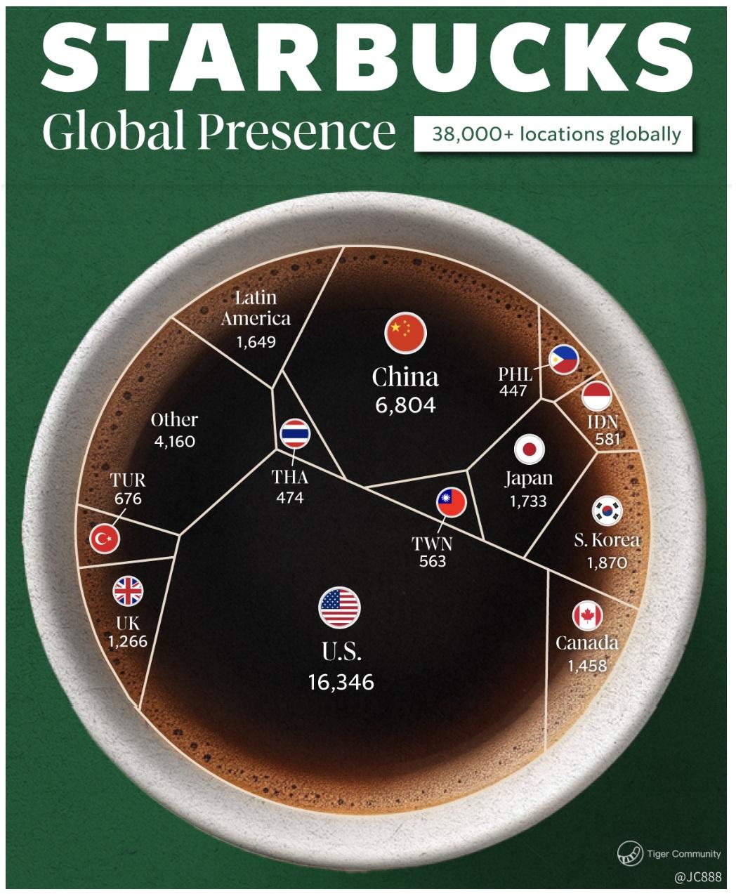 Looking at a 2023 analysis breakdown of the 38,000 Starbucks locations (globally) - by country.