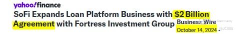 The latest - on 14 Oct 2024, SoFi announced a $2 billion deal with Fortress Investment Group to offer personal loans. (see above)