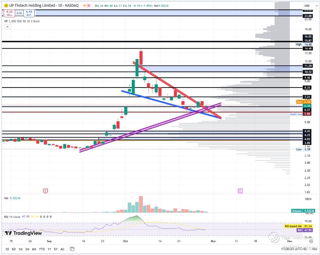 If we look at more recent price action, TIGR actually found a short-term low at the 78.6% Fib retracement (not pictured here) at 5.87, taking the swing low of 3.39 and high of 14.48. It has also, for the time being, confirmed this trendline that formed during the initial run-up.