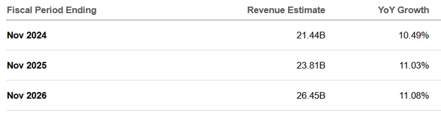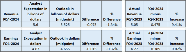 First, looking into the revenue guidance, it was $5.50 billion to $5.55 billion whose midpoint of $5.525 billion was below analysts' expectations of $5.6 billion by 1.3%. The mid-point of the EPS guidance of $4.63 to $4.68 fell short of what analysts expected by 0.3% as calculated in the table below. Moreover, based on the outlook provided, the revenue in Q4 should grow over the same period in 2023 by over 9%, but this would mark more than 1% deceleration, both on a YoY and sequential basis.