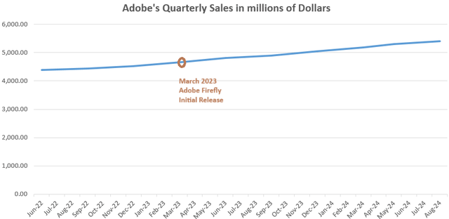 Its ability to charge higher will also depend on the productivity benefits to be derived by its customers. In this respect, while some reports credit GenAI with allowing designers to be more productive on creative tasks others are more cautious as to the prospects. Consequently, unless there is an acquisition, the company is likely to continue increasing revenues gradually, or by an average of 10.6% since the initial release of Adobe Firefly in March 2023 as shown below.