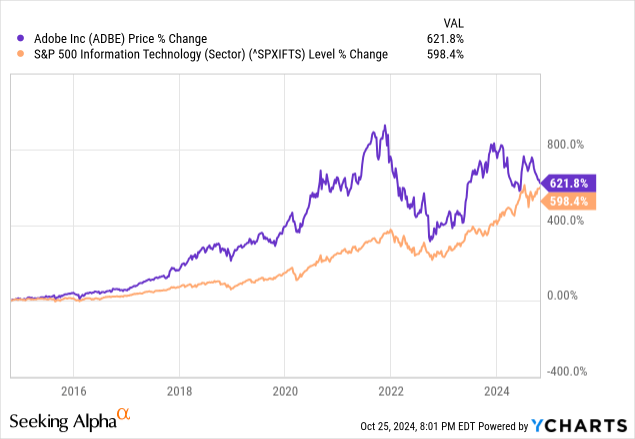 Thus, if it does not improve growth rapidly, it will be again punished hard, which is why it is not advisable to invest at the current juncture. To this end, the blue chart below shows the degree to which Adobe has been volatile relative to the S&P 500 Information Technology sector. Now, given it is not growing according to Wall Street's expectations currently, its outperformance of about 23% (621.8-598.4) does not make sense. Thus, I believe it could potentially fall to the $372.5 (483.72 x 0.77) level based on its current share price of $483.72.