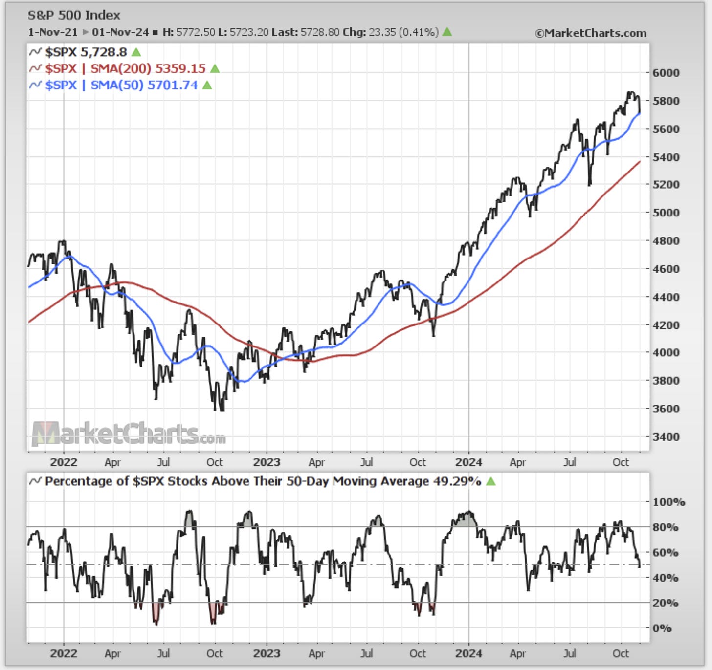 2. De-Risking: In the short-term there has been a clear bit of de-risking going on heading into election week, with just simple blind uncertainty serving as a prompt to step back and see what happens. The Index has pulled back to the 50-day moving average after peaking around mid-October, and breadth has dropped off to mildly oversold levels. So it’s set up well to rally if all goes smoothly in the week ahead — if you get a benign and clear election outcome then all talk will turn to year-end rallies and existing bullish momentum likely carries it higher.