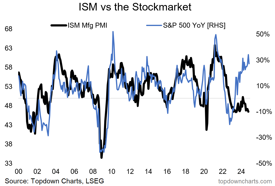 4. ISM Isn’t Confirming: For instance, the latest ISM manufacturing PMI dropped to 46.5 (vs expected 47.6) — which is a 16-month low, and stands in stark contrast to where the market usually travels with this indicator. You might argue that the market is right and this indicator is wrong and broken ever since the pandemic, but also…