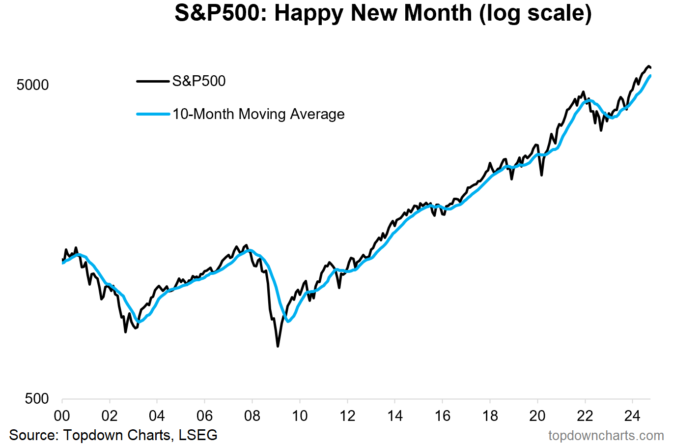 1. November is Here: The S&P500 dropped -1% on the month in October, breaking a 5-month streak of gains, yet still placing it up +19.6% YTD (21% including dividends) — and at the top of the table across the major asset classes. The cyclical bull market that began in October 2022 looks very much alive and well for now, and the trend is fairly strong with the index still comfortably above its 10-month moving average (which it has been for 12 months in a row now).