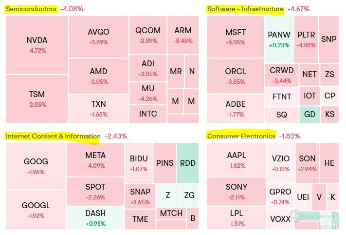 Most sectors (Semiconductors, Social media, Consumer electronics, Drug makers, eCommerce, Software Infrastructure & App, Banks, Insurance) were not spared. (see above)