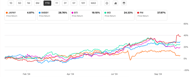 Price Returns YTD for JAPAY, IMBBY, BTI, MO and PM (Source: Seeking Alpha)