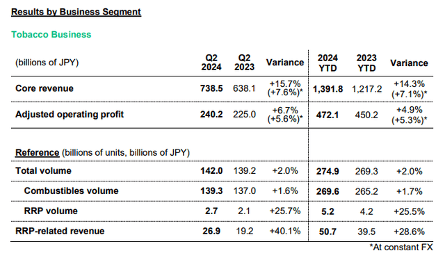 In defense of the company, this is a slight improvement over the 3.3% share in 2023, due to RRPs higher revenue growth. They grew by 28.6% YoY in H1 2024, a far bigger increase than the 14.3% YoY seen for overall tobacco revenues during the period. Their volumes also saw double-digit increases (see table below).