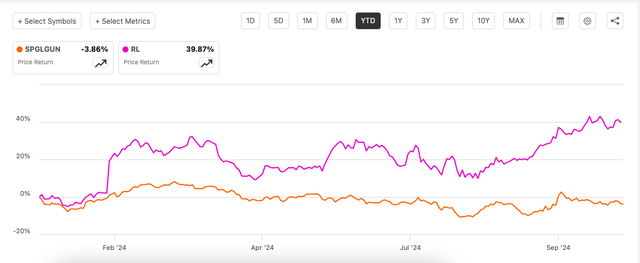 If there's any outlier luxury stock out there right now, it has to be Ralph Lauren (NYSE:RL). The S&P Global Luxury Index (SPGLGUN) is down by ~4% year-to-date (YTD), but in sharp contrast, RL is up by 40%.