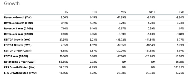 There are good reasons for a premium for RL, though. As the table below shows, it has performed much better overall in terms of both revenues and earnings. Specifically, the three-year compounded annual growth rate (OTC:CAGR) for revenues is at 7.9%, compared to the average of the five stocks at 2.5%. Similarly, the CAGR for EBIT is also good at 10.1%, second only to PVH at 14%.