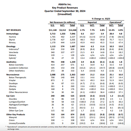 AbbVie's reported net revenue growth might have come off to 3.8% year-on-year (YoY) during the latest quarter from 4.3% YoY in Q2 2024, but at 3% for the first nine months of the year (9m 2024), the company is well on its way to seeing a turnaround after seeing a contraction of 5.4% in 2023.
