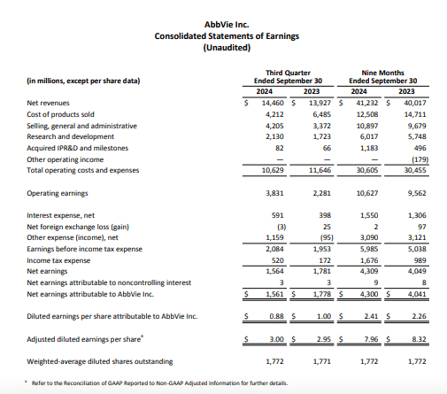 Since I last checked on pharmaceutical company AbbVie Inc. (NYSE:ABBV) in August, its share price hasn't gone anywhere. But the release of its third quarter (Q3 2024) results shows investors are happy with the numbers, rewarding the stock with over a 6% rise in intra-day trading as I write.