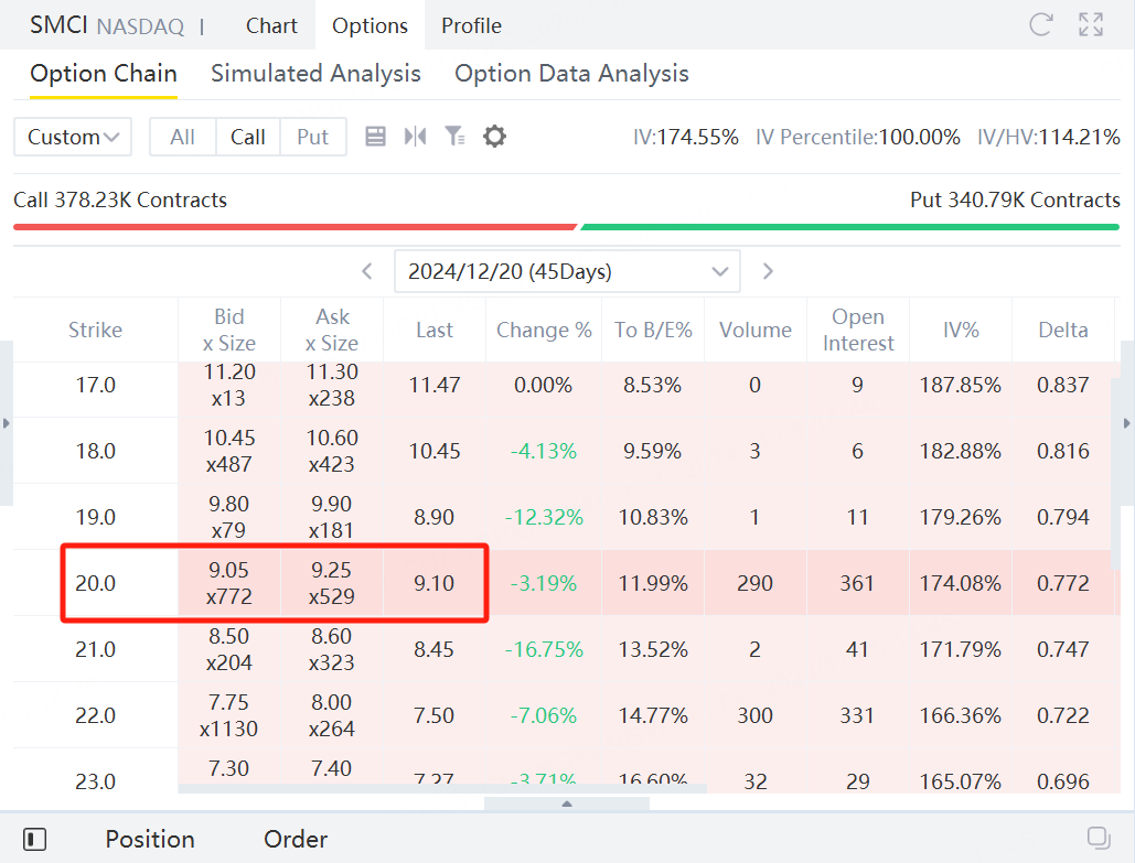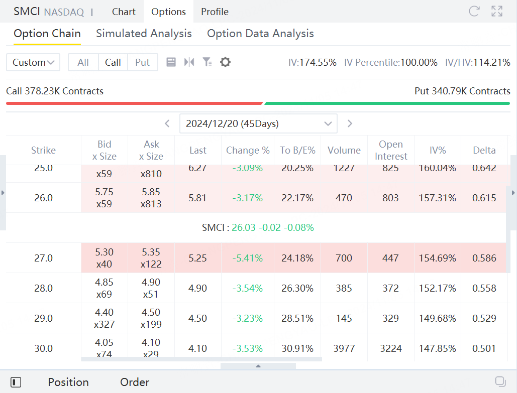 Taking SMCI as an example, suppose SMCI’s current price is $26, and an investor anticipates a drop to around $20 by December 20. The investor can use a bearish call spread strategy to short SMCI.