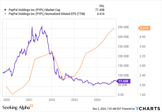 The business's fair value is $122 billion, significantly higher compared to PayPal's current market cap. The upside potential is 57%, which makes PYPL an extremely attractive investment opportunity. Some readers might say that a 57% upside potential suggested by my DCF is unrealistic, but just take a look at the below chart. My $122 billion fair value estimate looks very conservative compared to the market cap's historical maximums. Please also note that PYPL's EPS is currently at an all-time high.