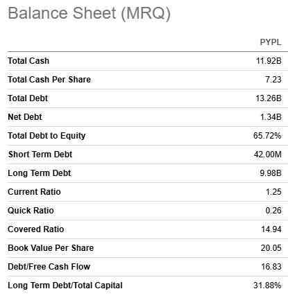 As a result of expanding profitability ratios, PYPL generated $1.6 billion in cash from operations [CFO] during Q3. The CFO was up by almost 30% YoY, which is certainly a strong performance. Strong CFO allowed the management to inject around $1.8 billion in stock buyback, which was beneficial for shareholders. PayPal's financial position is robust, with the cash balance just around 10% lower compared to the total debt.